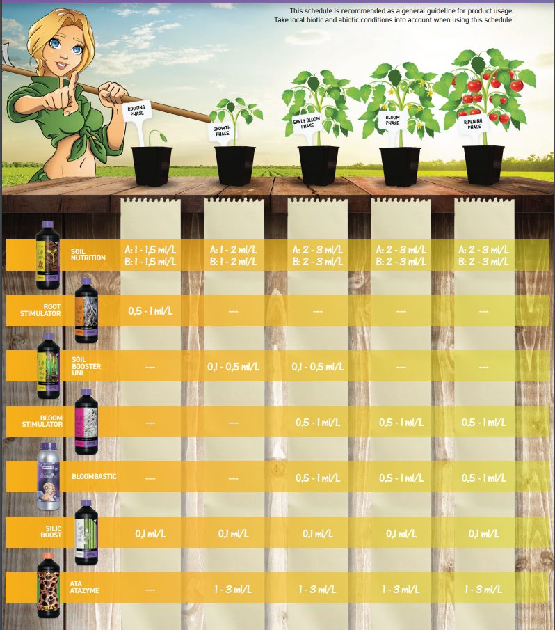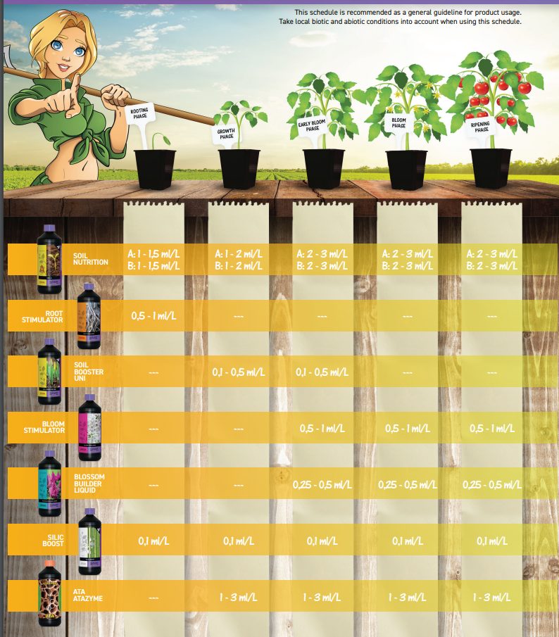 - Soil Nutrition A+B : engrais qui fournit les quantités nécessaires de nutriments pour maintenir la nutrition minérale la plus efficace de notre culture. Il peut s’utiliser dans n’importe quel système d’arrosage goutte-à-goutte.