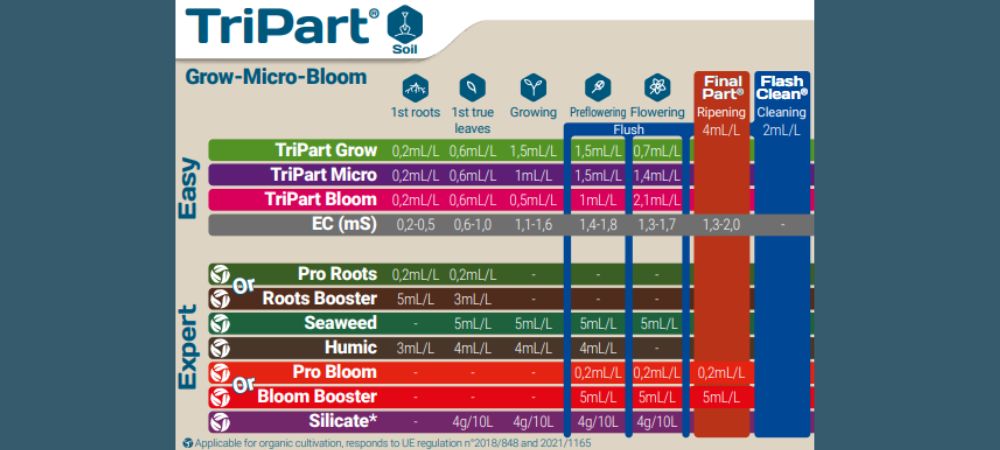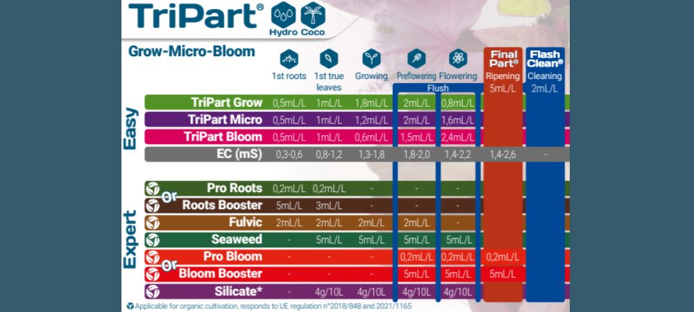 Le tableau de la gamme TriPart est divisé en deux sections : le tableau élémentaire et le tableau expert. Le schéma de culture facile comprend les engrais TriPart (Grow, Micro et Bloom), Final Part pour l’engraissement et FlashClean pour le lavage des racines. Le schéma de culture expert inclut les mêmes produits que le tableau standard, plus quatre additifs supplémentaires pour garantir des résultats dignes d’un pro.