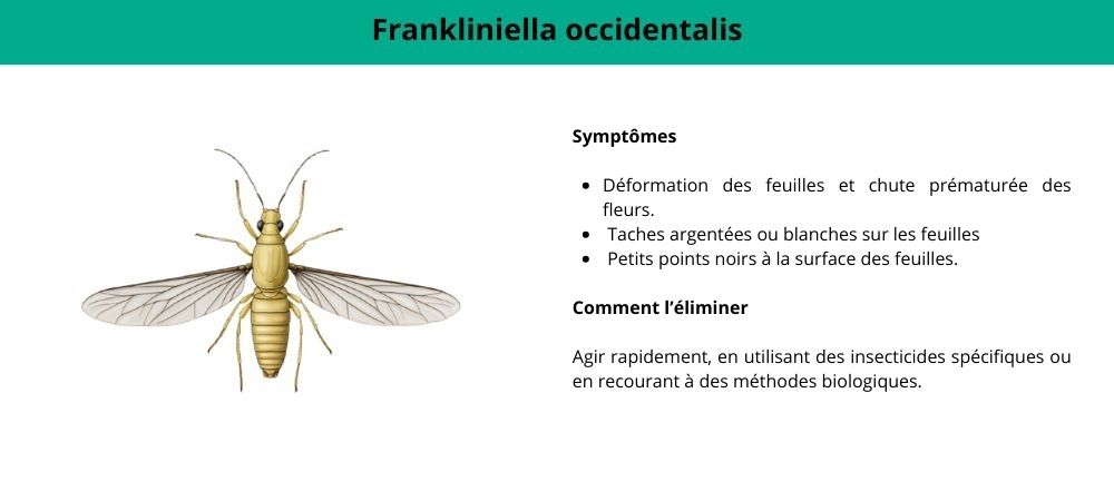 La Frankliniella occidentalis laisse des taches argentées ou blanchâtres sur les feuilles, et on peut aussi observer de petits points noirs (leurs excréments) à la surface. En secouant légèrement la plante au-dessus d’une feuille blanche, vous pourrez voir ces minuscules insectes bouger.